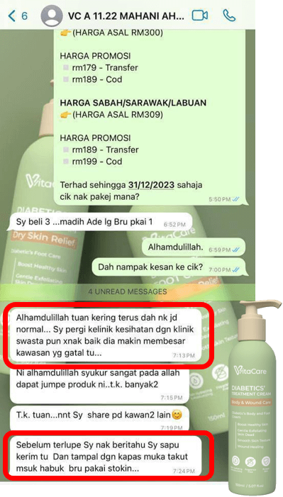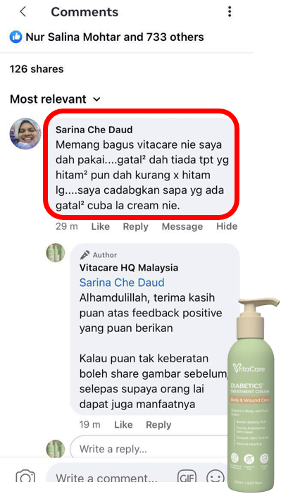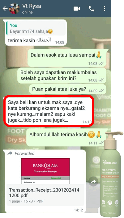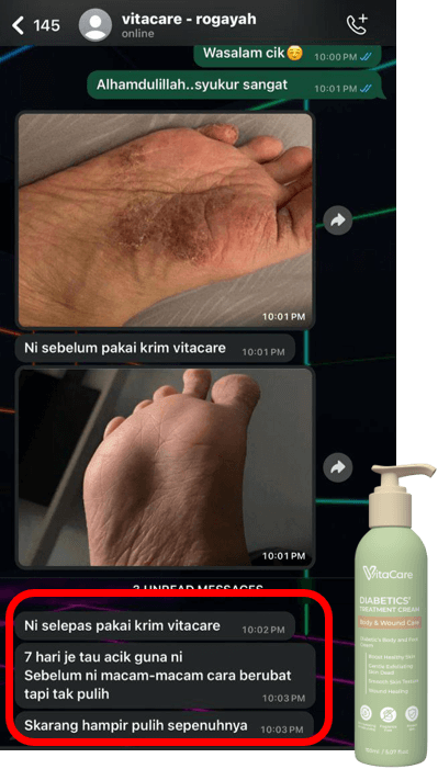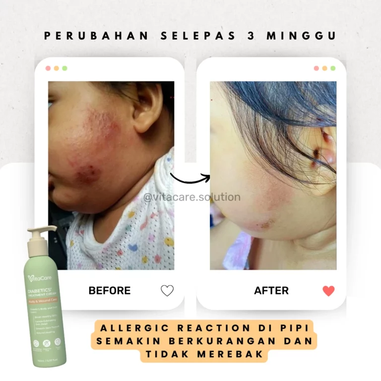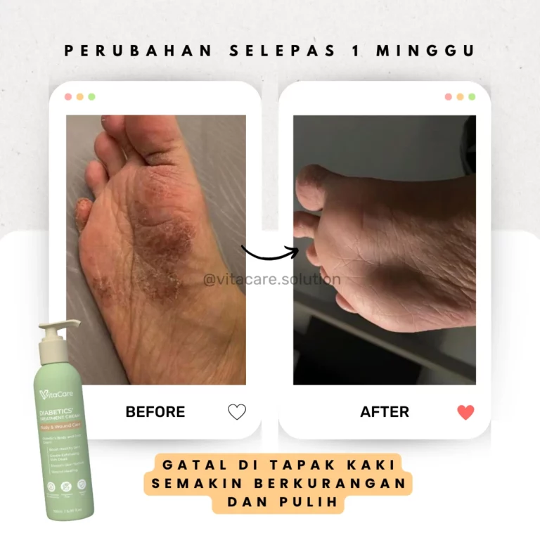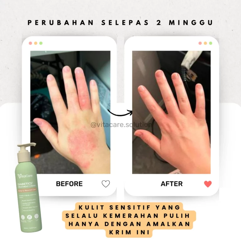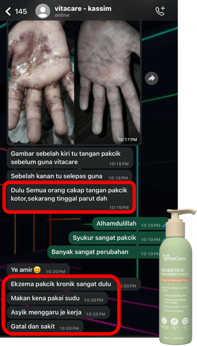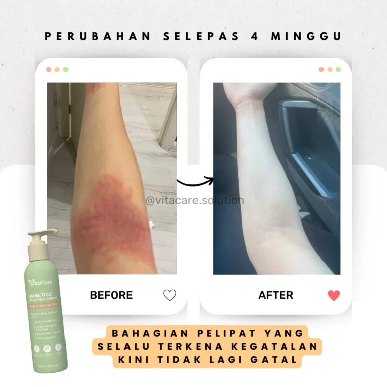 Konsisten guna Vitacare memberikan kesan positif dengan menghilangkan kegatalan. Kulit hitam berkurangan. Sekarang saya dapat fokus bekerja. Tidur pun jadi lena.
