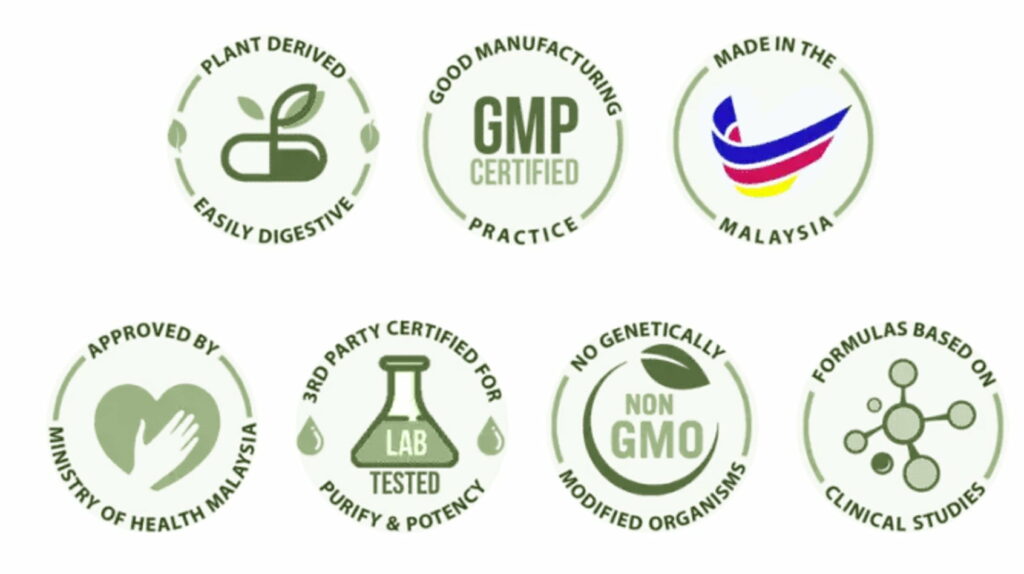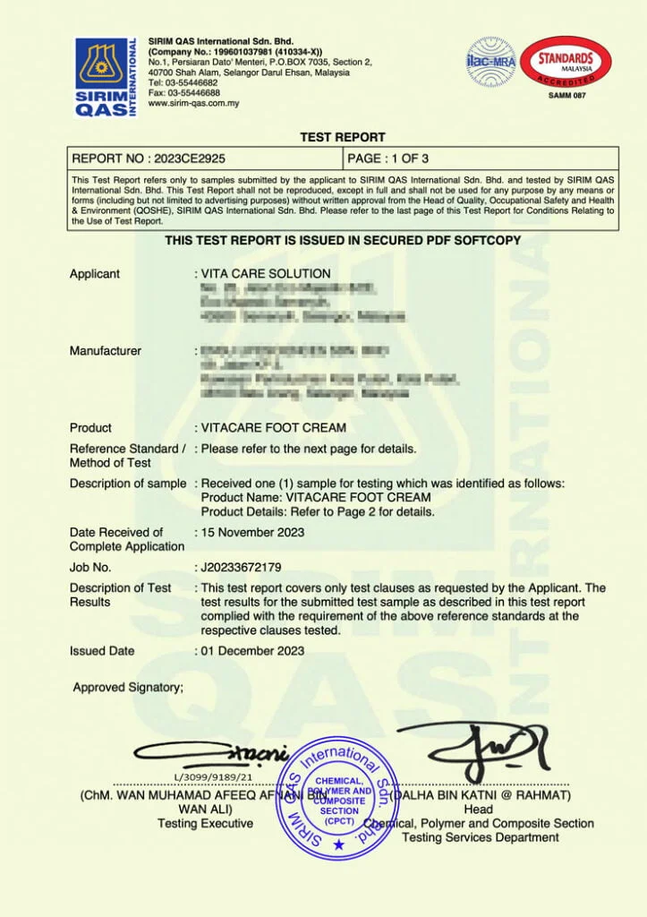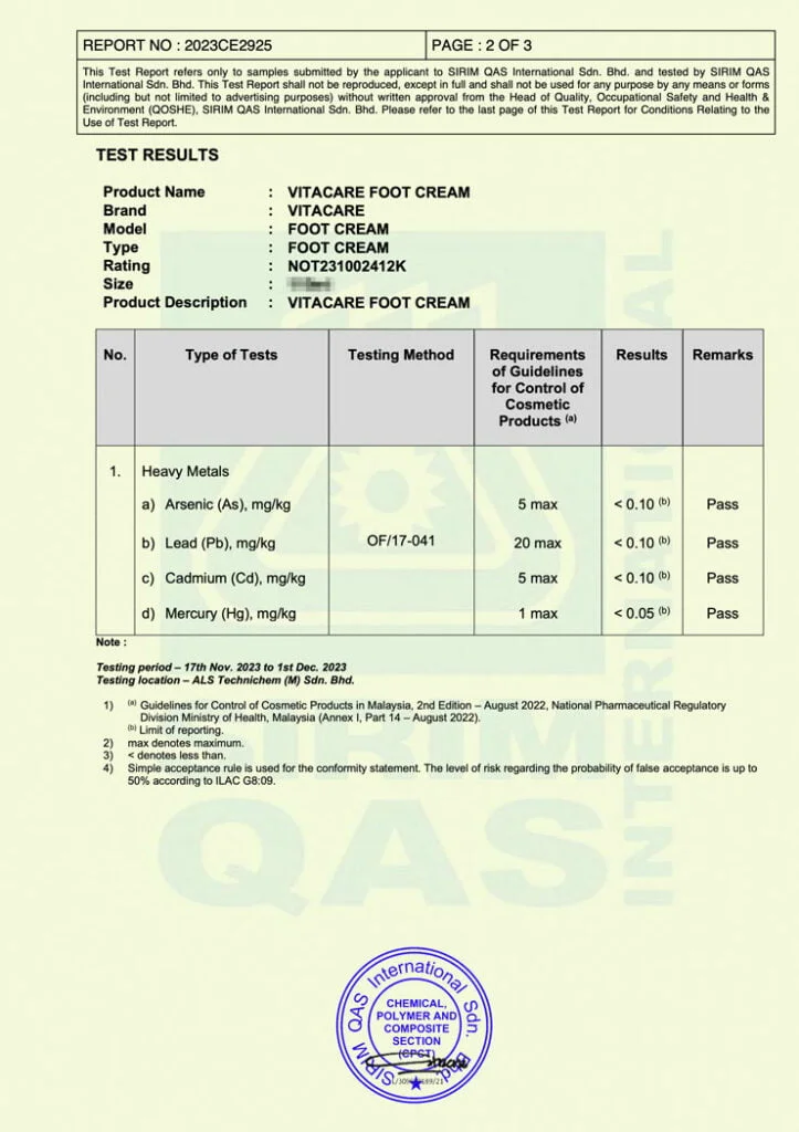 Vitacare telah mendapat kelulusan dari KKM & Pensijilan dari Independent Lab bebas dari heavy metal, steroid, dadah dan kimia merbahaya.